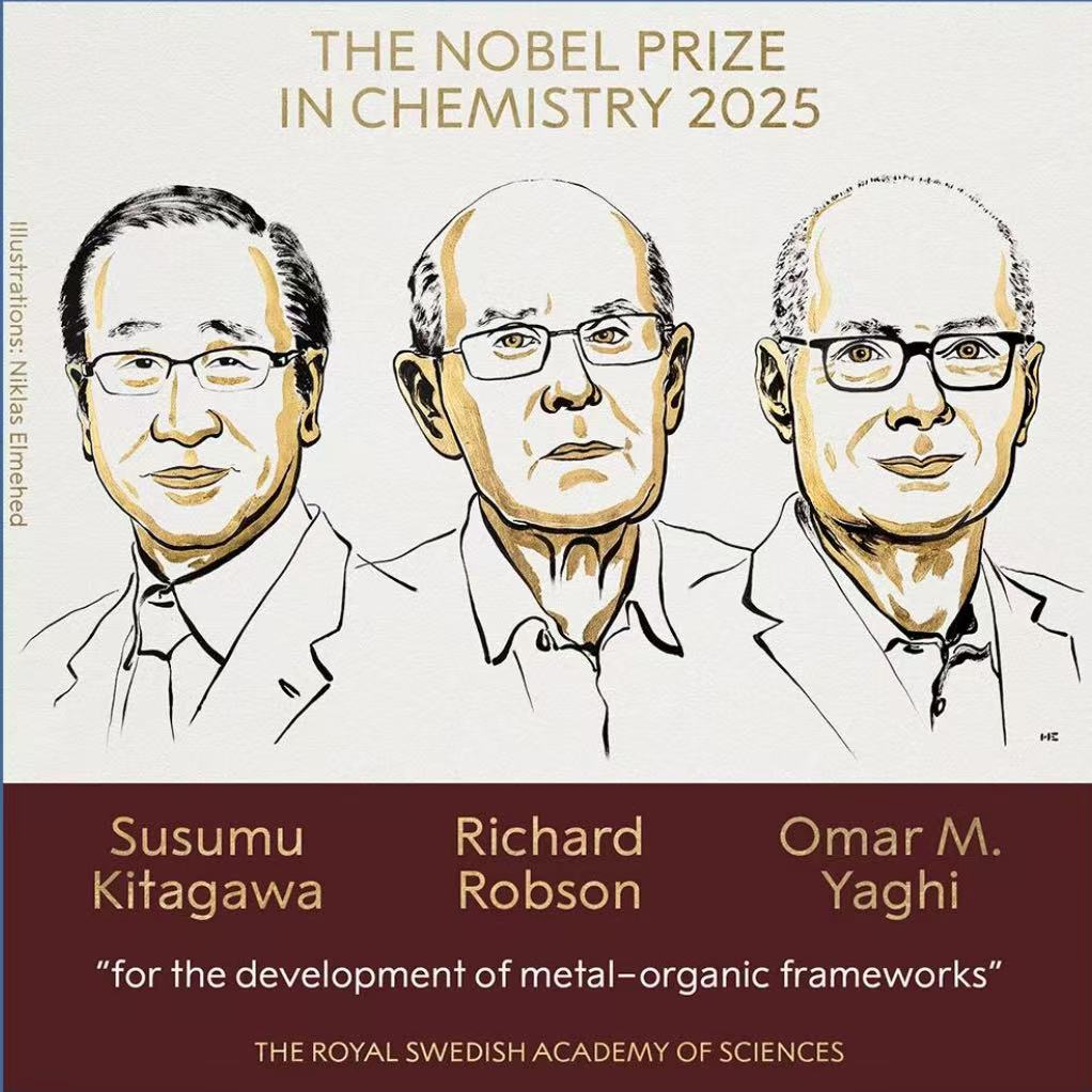 瑞典皇家科学院10月8日宣布,将2025年诺贝尔化学奖授予北川进、理查德·罗布森和奥马尔·M·亚吉,以表彰其“在金属有机骨架领域的贡献”。
