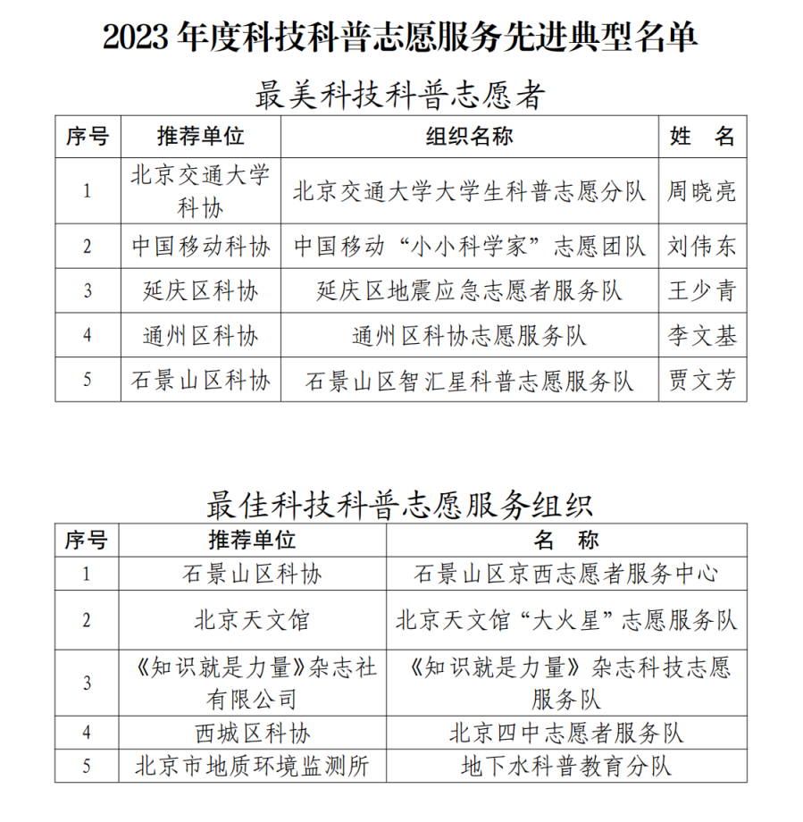 在第61个“学雷锋纪念日”来临之际,3月1日,2024年北京科技科普志愿服务周启动。本市5名科技科普志愿者、5个科技科普志愿服务组织、5个科技科普志愿服务项目和3个科技科普志愿服务点,被评为2023年度科技科普志愿服务先进典型。