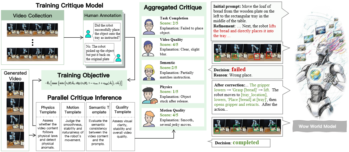 如果说庞大且高质量的交互数据是“教材”,那么WoW的核心创新之一,就是一套名为SOPHIA(Solver-Critic-Refiner)的“自学方法”。“北京人形”在其研究中称,这是“业内首次提出SOPHIA框架,让世界模型‘自己教自己’。”