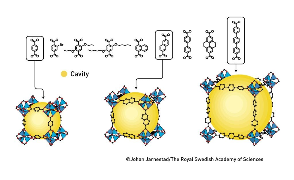 ▲在21世纪初,亚吉展示了生产整个MOF材料家族是可能的。他改变了分子连接体,从而得到了具有不同性质的材料。其中包括16种MOF-5的变体,其孔穴大小各异。©Johan Jarnestad/瑞典皇家科学院