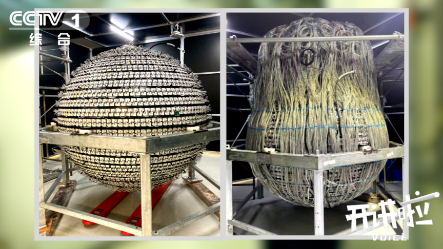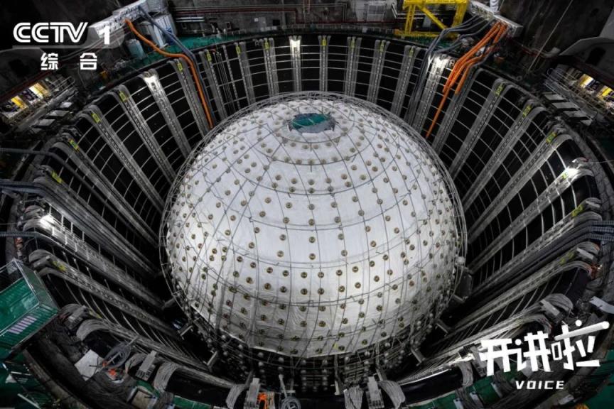 如何捕捉到迄今为止人类对其了解很少的中微子?曹俊介绍,江门中微子实验拥有世界上最大的液体闪烁体探测器,由近1000吨不锈钢钢架、263块有机玻璃、2万吨液体闪烁体、4万吨超纯水和4.5万只光电倍增管组成。液体闪烁体是一种能让中微子发生反应并发光的神奇液体,装在一个足有13层楼高的巨大有机玻璃球中。为了放大所捕捉到的信号,这个装置比此前全球最大的液闪探测器要大20倍,仅螺丝就超过12万套。