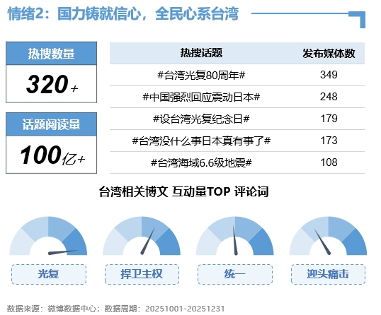 与此同时,全民心系台湾,涉及国家核心利益的议题,例如“台湾光复纪念日”等相关话题获得高强度关注。